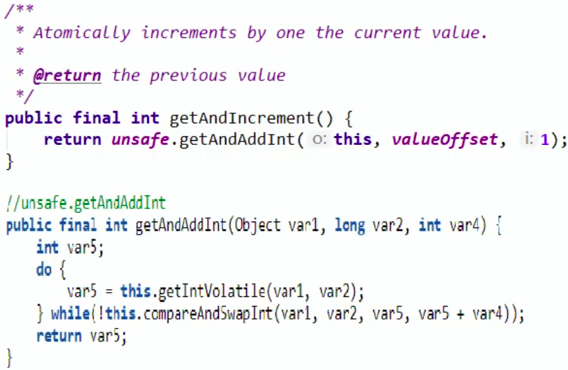 在之前讲volatile时,我们使用 atomicInteger.getAndIncrement(); 解决了 number++; 在多线程环境下的线程安全问题,它的底层源码实现为:
